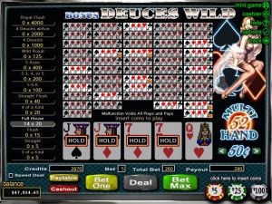 In Deuces Wild, deuces are wild and special payouts are given for four-of-a-kind deuces and Wild Royals. You can play a single hand and take your chance at doubling your win in the Double or Nothing Bonus Round or you can play 3, 10, 52, or even 100 hands at a time!
