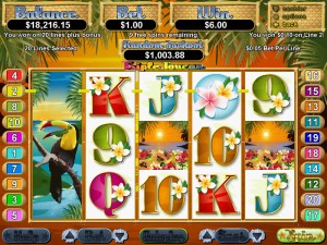 Three or more Fruit symbols appearing anywhere triggers the 9, 15, or 25 free game features. If a substitute Toucan symbol appears during free games it will expand to cover the entire reel and triples the prize. Additional free games can be won during the free game feature.