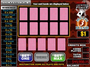 In Double Jackpot Poker, Jacks, Queens, Kings, and Aces in groups of four are the heart of the game with multiple payouts offered on these special four-of-a-kind hands. Turn your top cards into winning poker hands for big payouts or go for a super big payout by betting max credits on a Royal Flush. You can play a single hand and take your chance at doubling your win in the Double or Nothing Bonus Round or you can play 3, 10, 52, or even 100 hands at a time!