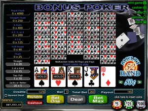 In Bonus Poker, the bonus is in the payouts for four-of-a-kind hands. You can play a single hand and take your chance at doubling your win in the Double or Nothing Bonus Round or you can play 3, 10, 52, or even 100 hands at a time!