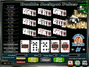 In Double Jackpot Poker, Jacks, Queens, Kings, and Aces in groups of four are the heart of the game with multiple payouts offered on these special four-of-a-kind hands. Turn your top cards into winning poker hands for big payouts or go for a super big payout by betting max credits on a Royal Flush. You can play a single hand and take your chance at doubling your win in the Double or Nothing Bonus Round or you can play 3, 10, 52, or even 100 hands at a time!